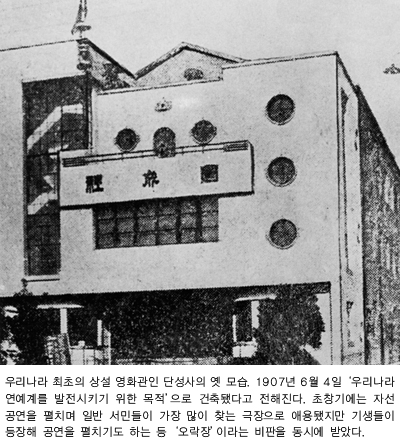 “신문 보도에 의하면 1909년을 기준으로 서울에서 매춘에 종사하는 여성의 수는 2,500명 정도였다. 이들의 주요 활동 장소가 연극장이었다. 공권력은 사복 경찰을 연극장에 비밀리에 투입하여 매춘에 종사하는 사람들을 검거하기 시작했다.”