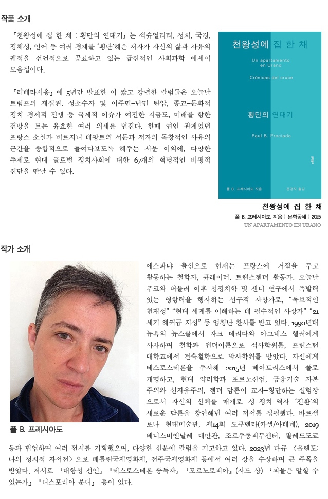 프레시아도의 『천왕성에 집 한 채』는 프랑스 일간지 「리베라시옹」에 연재한 칼럼들의 모음집이다. 말하자면 프레시아도가 천왕성에다 종이로 지은 집이다. 철학적이고 논쟁적인 전작들에 비하면, 이 책은 문학 텍스트로 읽어도 될 만큼 반짝이는 비유로 책 읽는 재미가 상당하다. 아미타브 고시는 우리 시대의 대혼란은 무엇보다 상상력의 결핍에서 비롯된다고 말한 바 있다. 프레시아도의 책을 읽으면, 우리 시대의 젠더 대혼란에 신선한 상상력을 제공하고 있다는 느낌을 받는다.