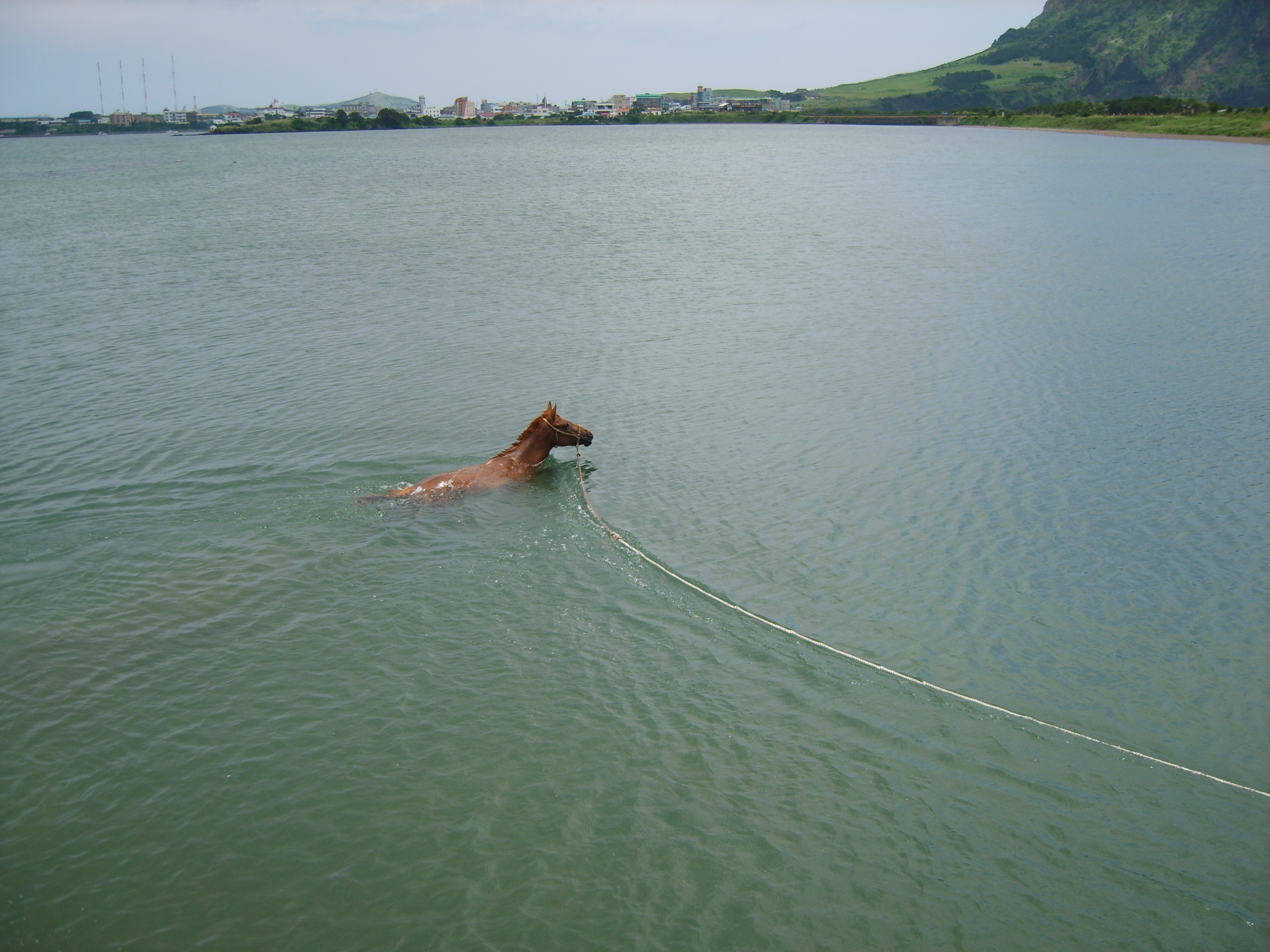 경주마는 콧김을 뿜으며 힘겹게 훈련에 열중한다. 말이 뭍으로 나오려고 할 때마다 주인은 “워이~ 쉬이익” 하는 소리를 내며 말을 물 가운데로 몰아넣는다. 말은 물질에 제법 능숙하다. 정상적인 말은 하루 30분씩 일주일만 수영 연습을 시키면 된다. 하지만 저 말은 지난 목요일에 경마장에 입소했다가 다리 근육이 뭉쳐서 아팠던 말이라 훈련 시간이 더 길다. 일주일 정도 훈련을 시킨 다음에 다시 경마장으로 보낼 예정이다. 제주마은 장시간을 뛰어도 지치지 않는다. 힘이 세고 질병에도 강하다. 경주마가 될 제주마는 태어난 지 한 달이 될 때 어미젖을 뗀다. 더 이상 키가 자라지 못하도록 하기 위해서다. 사료로 양분을 조절하며 맞춤으로 키운다. 강제로 말의 키를 제한하는 것이니 멀쩡한 나무를 분재로 만드는 것과 같다.