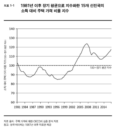 지금 주목할 만한 변화가 선진화된 자본주의 경제에서 일어나고 있다. 주택을 보유하는 것과 주거 문제가 상당수 사람들에게 점점 더 돈이 많이 드는, 즉 감당할 수 없는unaffordable 수준이 되고 있다는 것이다. 2000년대 초반 이후 거의 모든 선진국에서 소득 대비 주택 가격의 비율은 장기적인 평균치보다 현저히 높아지고 있다〈도표 1-1〉 참조. 2007-2008년에 글로벌 금융 위기를 겪으면서 그 비율이 다소 낮아지긴 했지만 2013년 이후 급격히 다시 상승하고 있다.