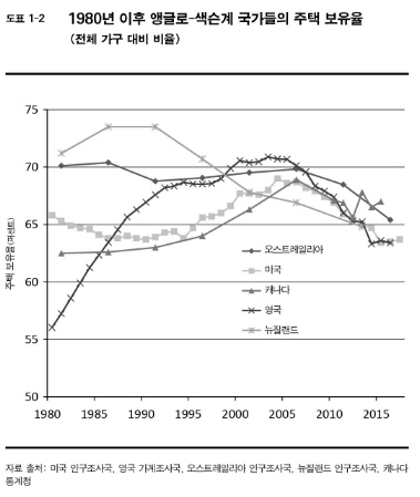“열심히 일하면 우리도 내 집을 가질 수 있다”라는 자유주의 자본주의 경제의 기본적인 약속은 더 이상 유효하지 않다. 〈도표 1-2〉에 나타난 것처럼 21세기로 접어들면서 모든 주요 영어권 국가들에서 주택 보유율은 크게 하락했다.